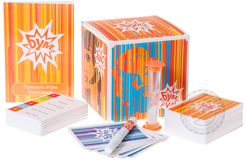 Цель игры: набрать наибольшее число очков по итогам трех раундов, угадывая и объясняя имена людей, написанные на картах. Игра «БУМ» — это отличный способ весело провести время, блеснуть своей эрудицией и актерскими способностями, а также узнать (или вспомнить) многих замечательных людей!
