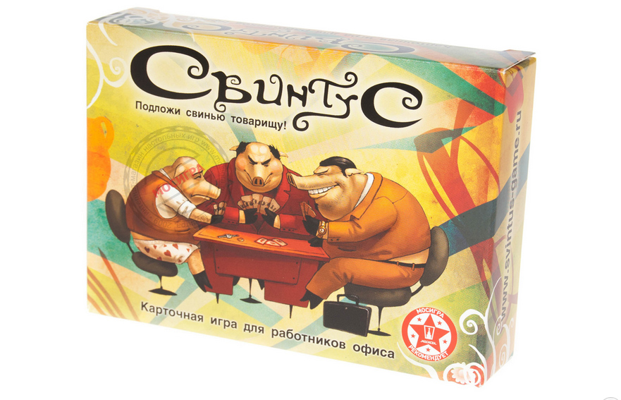 «Свинтус» — это простая карточная игра в «антикарнеги»-тематике. В основу лёг так называемый «американский дурак», но со «свинячими» правилами и большим набором дополнительных карт. Правила просты — избавься от всех карт и подставь коллегу.