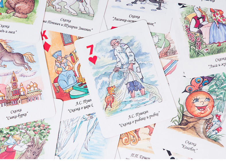 С самых старых русских сказок начинается знакомство ребенка с миром волшебных историй. Так что, в этой колоде своих знакомых найдут даже те, кому едва исполнилось пять лет. Курочка ряба? Да вот же она! Царевна-Лягушка? Сидит со стрелой и улыбается. 36 веселых характерных картинок, выполненных профессиональными детскими художниками, станут основой для многих развлечений, и чем старше будет становиться малыш, тем более сложные правила он сможет использовать — благо, в комплект входит детальное изложение 12 разнообразных карточных игр.